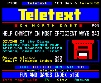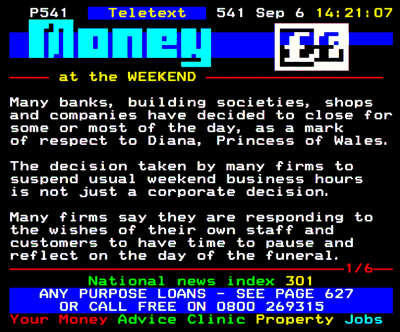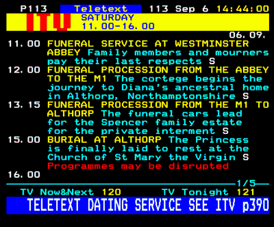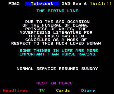 * As Russ suggests, they were possibly going for a more 'business as usual' approach on 4 given it had already been widely reported the channel they were carried on weren't going to be broadcasting the funeral. Obviously the C4 Teletext racing was the main section where this was impossible due to there being no racing that day.