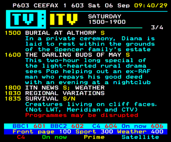 If Channel 4 did get criticism for their children's schedule it was most definitely undeserved. Kids would've wanted something to watch on a Saturday morning, and they most likely didn't want to watch a coffin or crowds of people crying. And the tone of the continuity was pretty spot on for the mood of the day.
