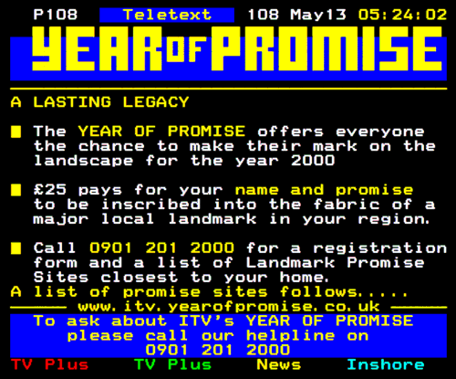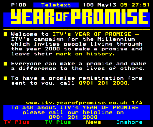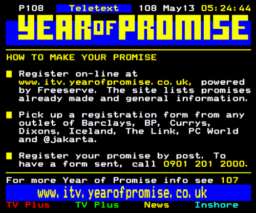 Seeing as there's a bit of discussion around the ITV Year of Promise, and I didn't have these available at the time of the original thread 3 years back, have the generally promoted Page 108 from Teletext from May 13th 2000 - about 2 weeks after their Day of Promise, although it makes no mention of the day. Page 107 also features loads of charity contact details - probably of less interest, but I can clean it up if people want.